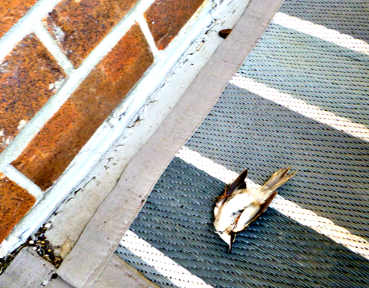 The bird, possibly a migrant, collided with a pane of glass, possibly the door onto Rob’s balcony. Fortunately, the impact didn’t prove fatal and the bird, perhaps a little wiser, was able to fly away from the incident.