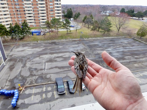 The moment of truth arrived when the Brown Creeper successfully flew away to nearby woods when carried to the edge of the eighth-floor balcony.