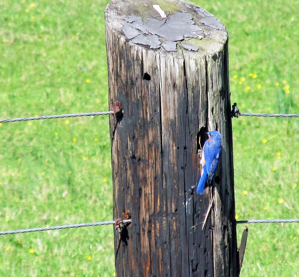 Bluebird-FencePost ← Previous Next → Photo by Bryan Stevens A male Eastern Bluebird inspects a nesting cavity in a wooden fence post.