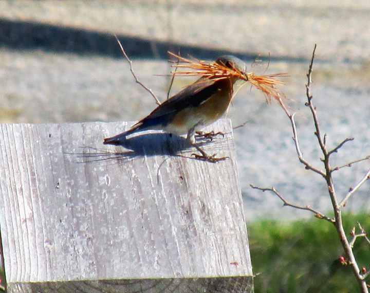Bluebird-withPineNeedles ← Previous Photo by Bryan Stevens • A female Eastern Bluebird gathers pine needles to use as nesting material.