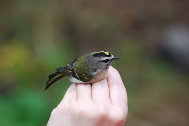 Photo Courtesy of Jean Potter A Golden-crowned Kinglet is held securely during a bird-banding procedure. The crown of golden-yellow feather that gives the bird its name is clearly visible.