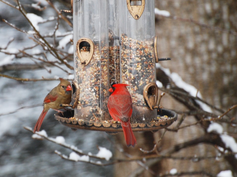 Cardinal-Pair ← Previous Next → Photo by Jean Potter A pair of Northern Cardinals perch on a feeder for a meal of various seeds.