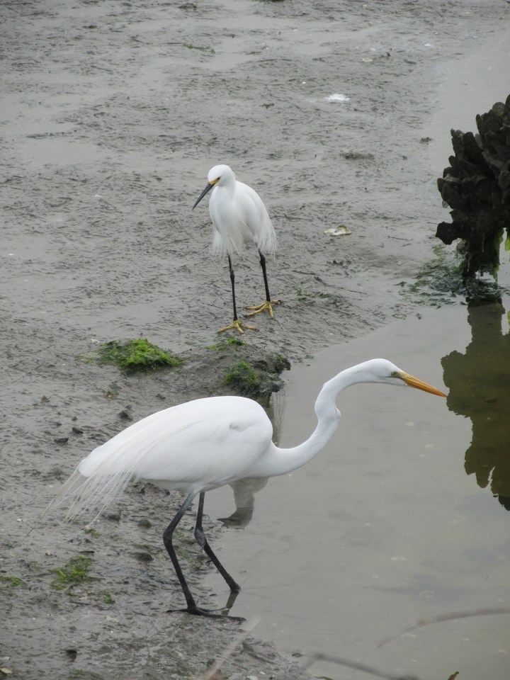 Egreta ← Previous Next → Photo by Bryan Stevens • A snowy egret and a great egret forage for prey on a South Carolina tidal creek.