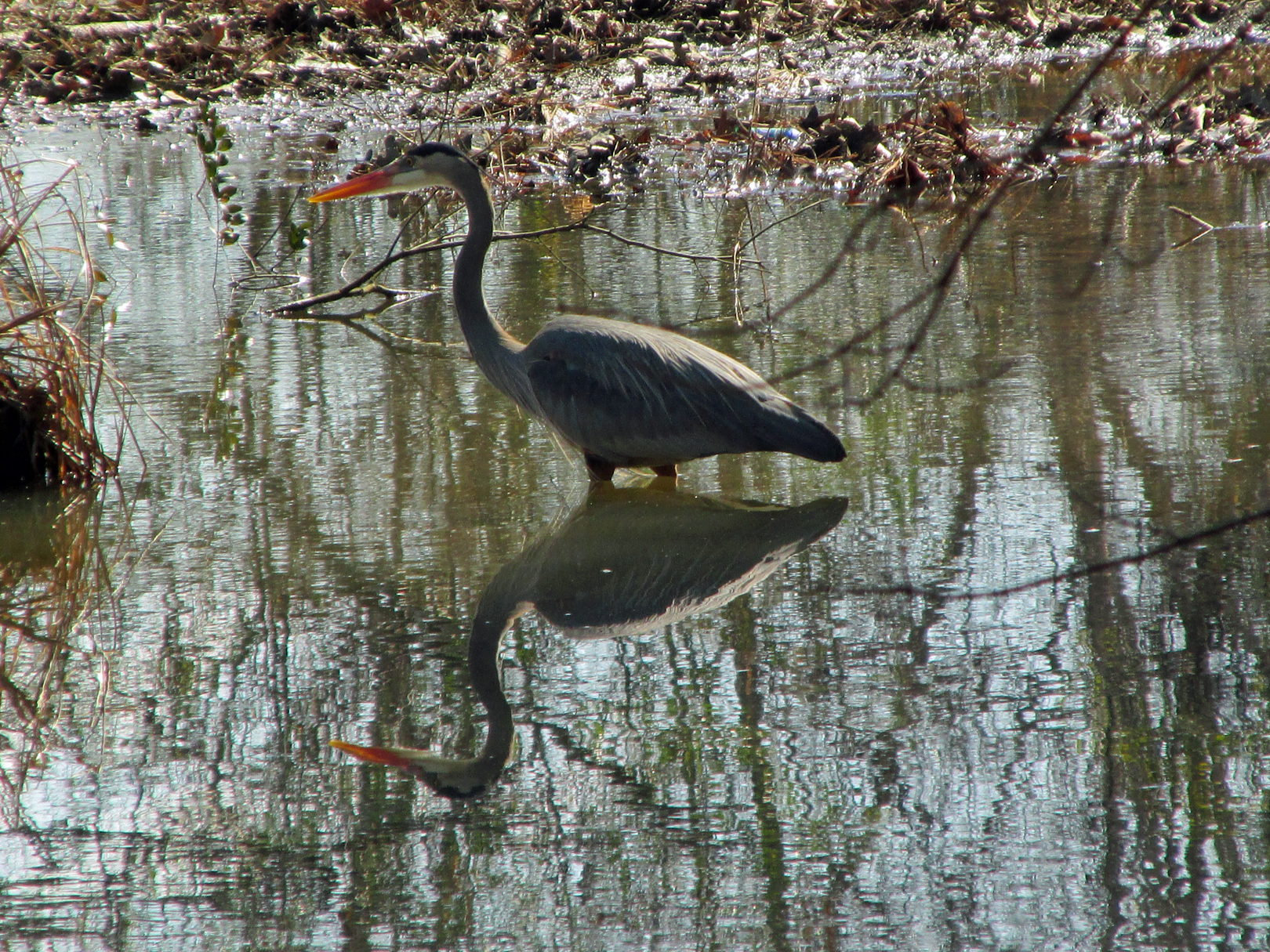 I’m not particularly given to these sorts of whimsy, but I felt rewarded that the heron had been willing to trust me so far. I didn’t really need a camera to record for memory the large bird’s actions. On a couple of occasions, the heron stabbed its bill into the water lilies and other aquatic vegetation along the creek’s edge. It even caught a small fish that quickly disappeared down the bird’s long neck and into the waiting stomach.