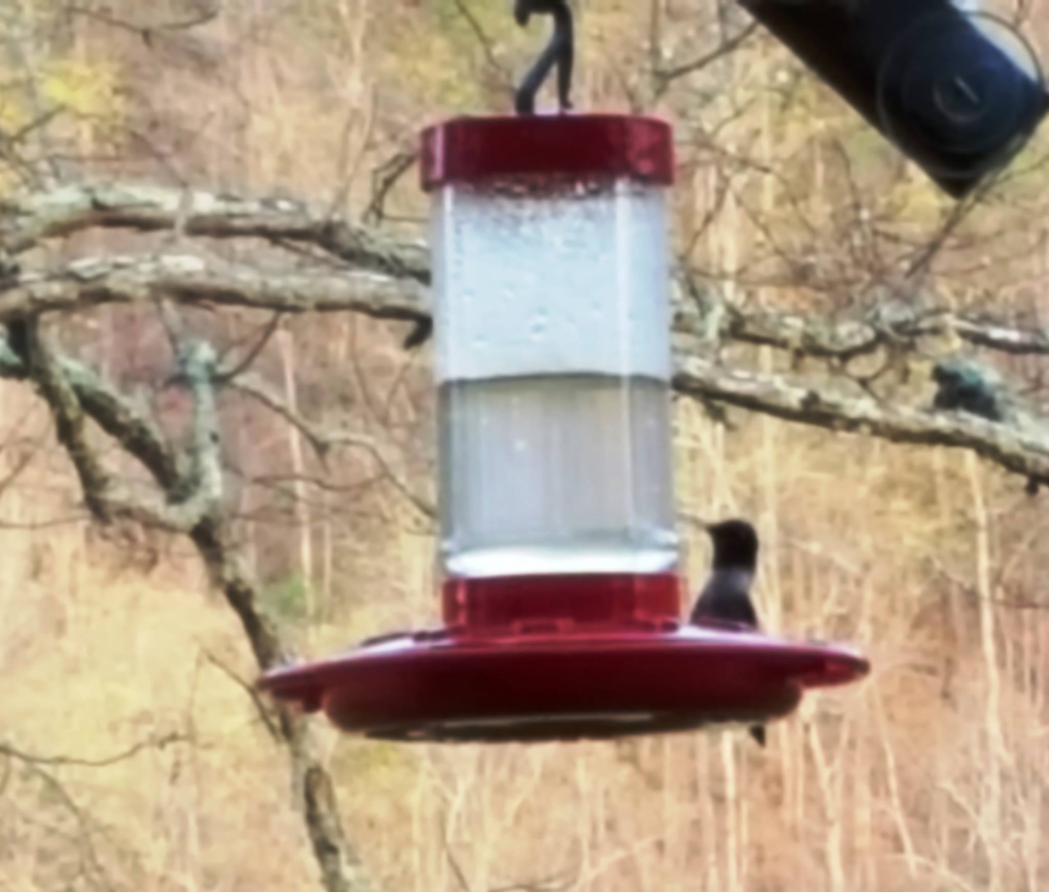 “I was having my morning coffee … looking out at the frost we got in Marion last night,” she wrote. Then, from inside her home, she happened to notice something. Giving her sugar water feeder a closer look, she was surprised to see a hummingbird perched on it.
