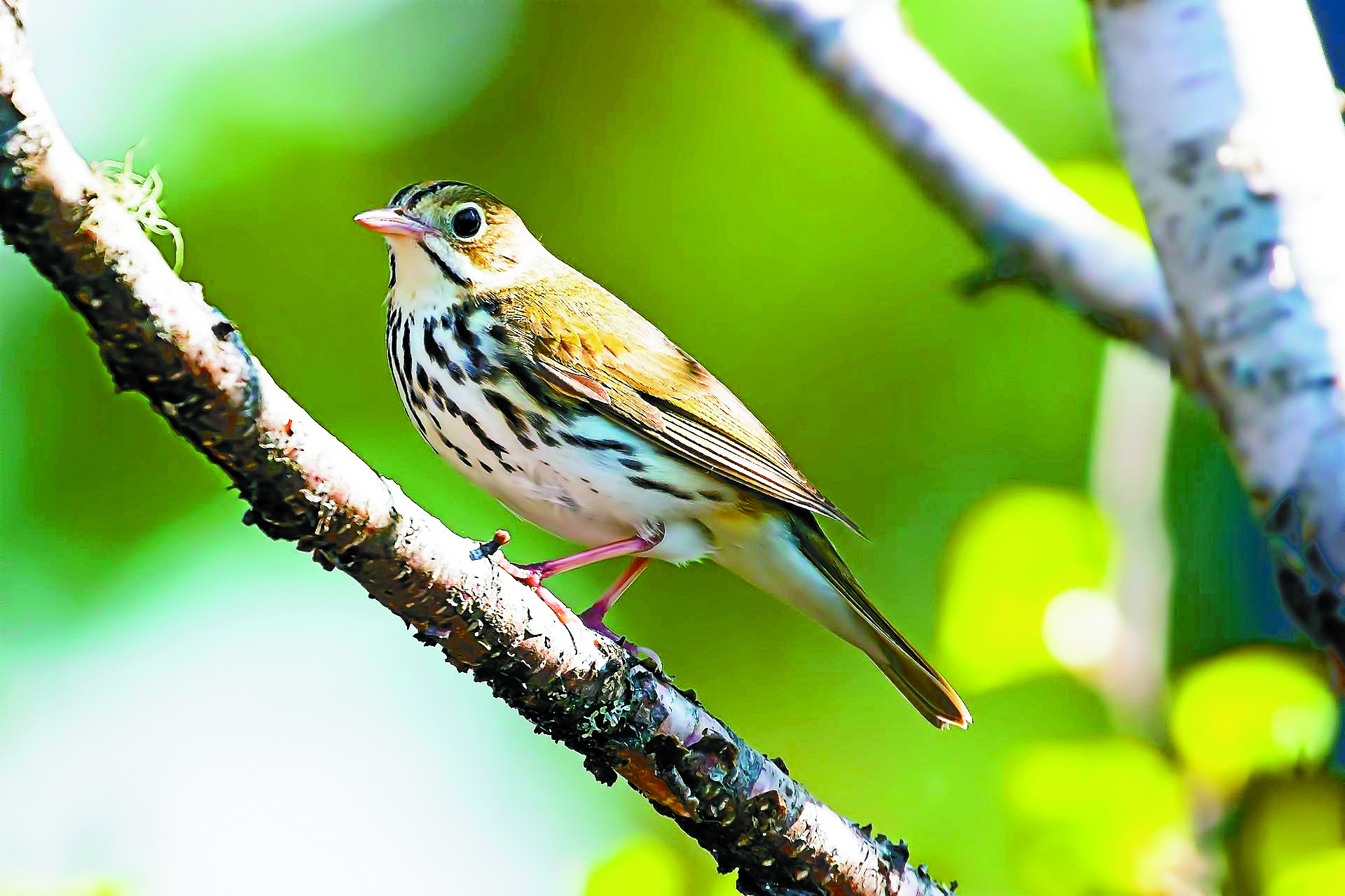 Photo by Hans Toom/Pixabay • An ovenbird, a member of the warbler family, perches on a branch. The bird gets its name from the shape of its nest, which resembles an old-fashioned Dutch oven. When male ovenbirds arrive on a potential nesting territory in the spring, they begin singing their loud, ringing “Teacher! Teacher! Teacher!” call almost tirelessly.