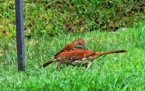 Returning to the expressive nature of brown thrashers, I think it’s the bird’s golden eyes that make them seem so alert and attentive. Once they feel secure in a lawn or garden, they become less shy. As one might expect from a large songbird, thrashers have voracious appetites. Among the feeder fare I offer, thrashers seem to prefer suet cakes. They’re not woodpeckers, however, so the awkward attempts of these long-tailed birds to access the suet offer some comic antics for observers.