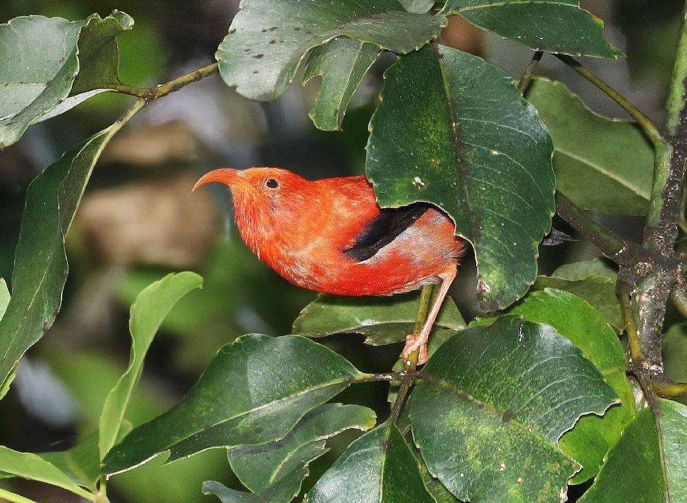 Photo by Jack Jeffrey/USFWS • A po’ouli relative, an ‘I’iwi forages in the Hakalau Forest National Wildlife Refuge, Hawaii. The bird’s long, downcurved, orange bill is specialized for sipping nectar from tubular flowers.