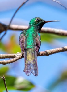 The term “emerald” describes many different species of hummingbirds. In the Caribbean, this family includes Hispaniolan emerald and Puerto Rican emerald. These hummingbirds belong to the genus Chlorostilbon, which is Greek for “green glitter,” a perfect description of the metallic green appearance of their feathers. Since my writing of the original column, experts have reconsidered the classification of the Cuban emerald. Based on a molecular phylogenetic study published in 2014 and a 2017 publication, the North American Classification Committee of the American Ornithological Society moved the species to the resurrected genus Riccordia. The Cuban emerald’s scientific name is now Riccordia ricordii.