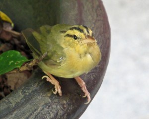 Worm-eating warbler: This species is not named for its appearance. Being saddled with the phrase “worm-eating” is also not entirely accurate. While fond of caterpillars, they do not consume earthworms. Its diet also consists of a range of small insects and spiders. Males and females are similar in appearance, blending in well with an “earth-tone” plumage of olive-brown with a warm buffy wash on their underside. Four bold black stripes border a buffy face. This warbler has a sharp bill that is longer than the bills of most other warblers. Don’t listen for any semblance of a musical song from this bird. Males produce a distinctive dry trill that could easily be mistaken for a sound produced by an insect.