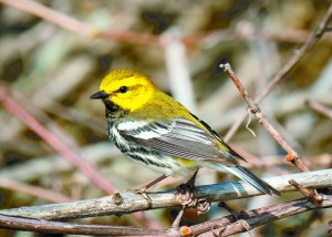 Black-throated green warbler: Males of this species have a bright yellow face with olive-green cheeks, crown and back. Only adult males have the namesake solid black throat. These warblers like the treetops where males repetitively sing a breezy, buzzy song that sounds sort of like “zoo-zee-zoo-zoo-zee.”