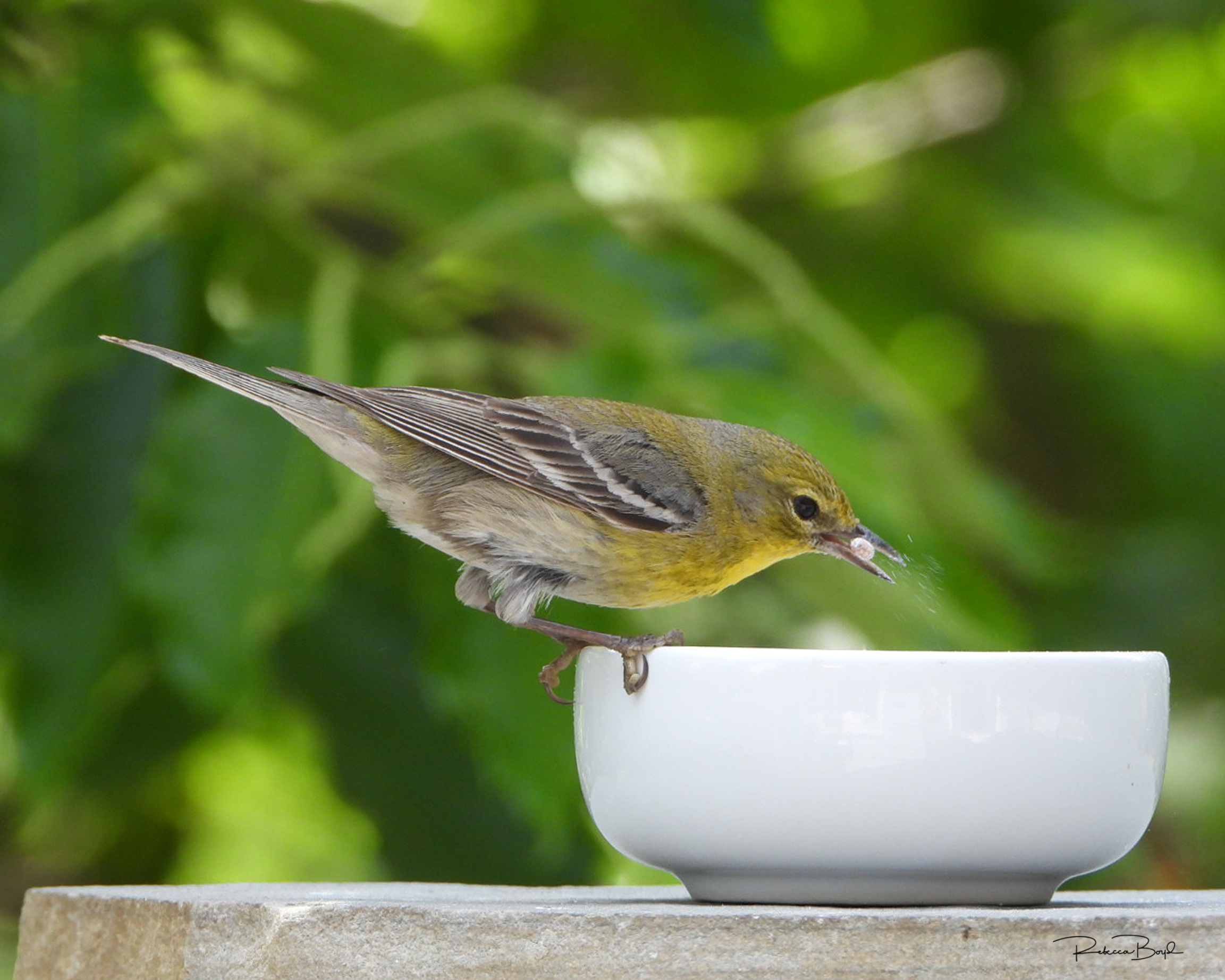 Pine warbler pair Petey and Petunia have raised two fledglings, which Becky dubbed Posey and Pansy.