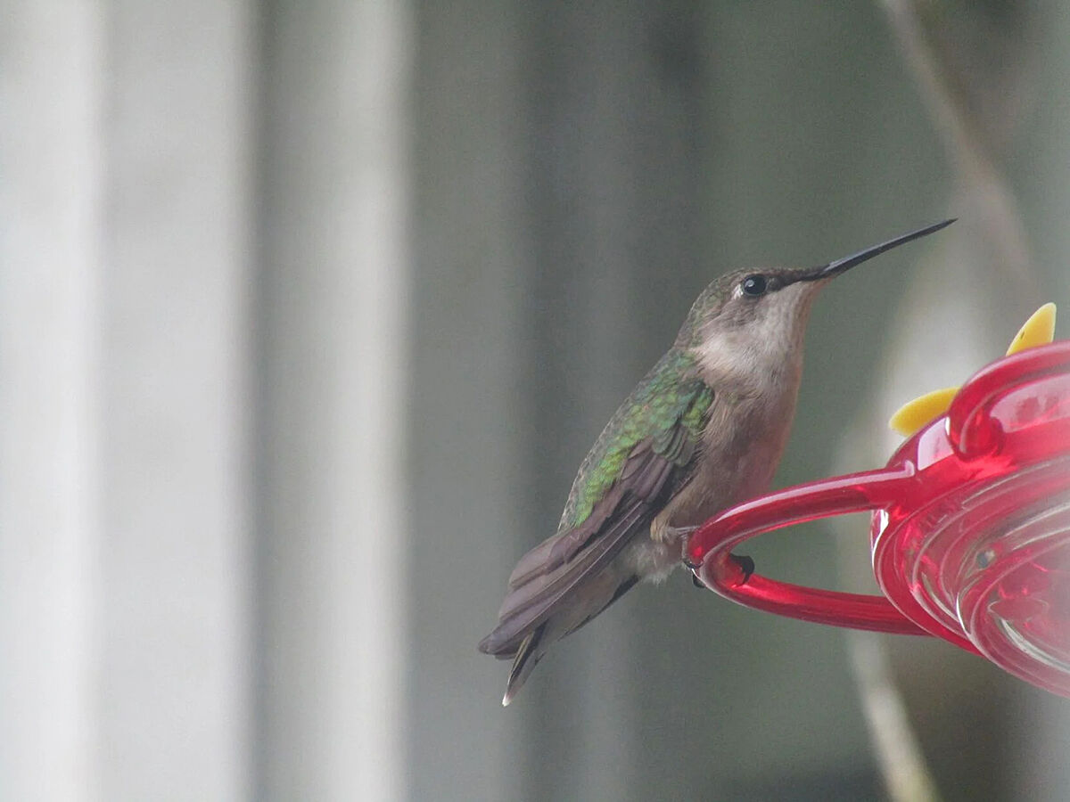Bryan Stevens • A female ruby-throated hummingbird perches on a feeder.