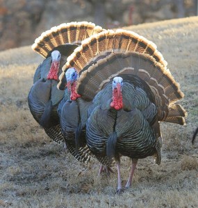 Larry Smith/USFWS • A trio of wild tom (male) turkeys parade with fanned tail feathers at Wichita Mountains Wildlife Refuge in Oklahoma. Toms are also known as gobblers.
