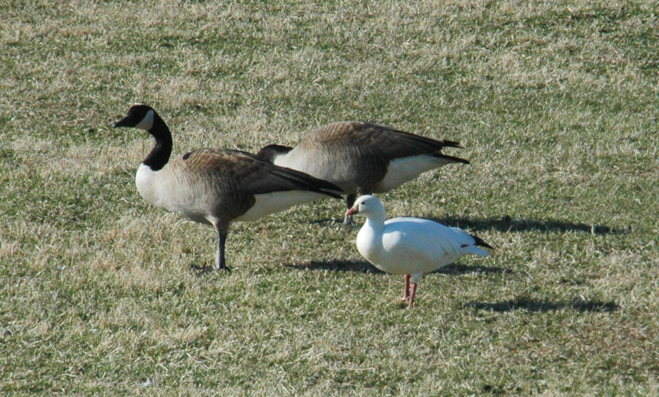 A Ross’s Goose, foreground, is shown with two Canada Geese. The photo makes plain the small size of the Ross’s Goose.