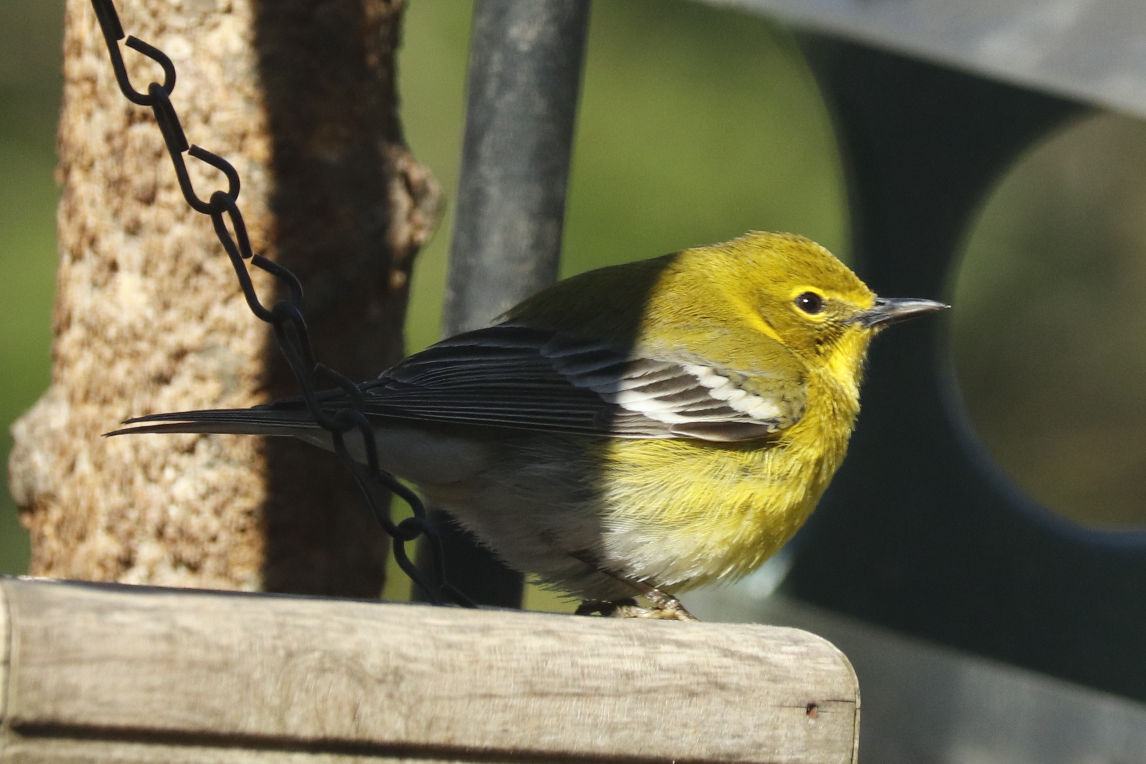 Kaylynn mentioned that her pine warbler has graced her with frequent bursts of song. This fact indicates that her bird is a male. Pine warblers are persistent singers, but they often sing their songs from the upper branches of tall pines, effectively camouflaging themselves from view. Pine warblers have become more frequent feeders visitors in recent decades, which brings them into closer proximity to humans than would otherwise be the case.