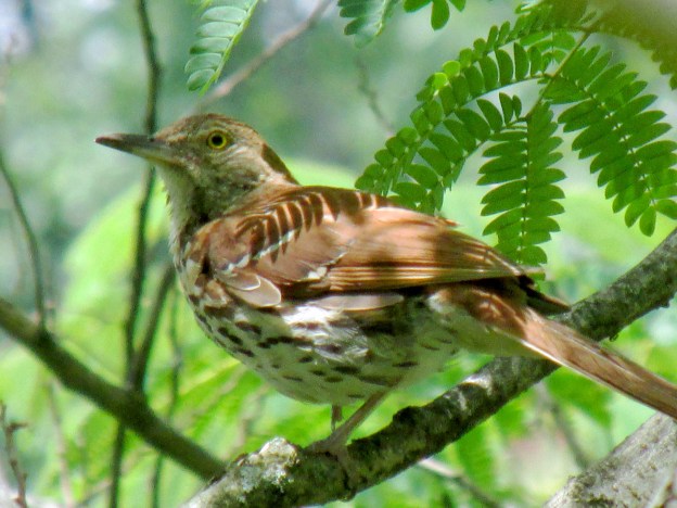 Returning to the expressive nature of brown thrashers, I think it’s the bird’s golden eyes that make them seem so alert and attentive. Once they feel secure in a lawn or garden, they become less shy. As one might expect from a large songbird, thrashers have voracious appetites. Among the feeder fare I offer, thrashers seem to prefer suet cakes. They’re not woodpeckers, however, so the awkward attempts of these long-tailed birds to access the suet offer some comic antics for observers.